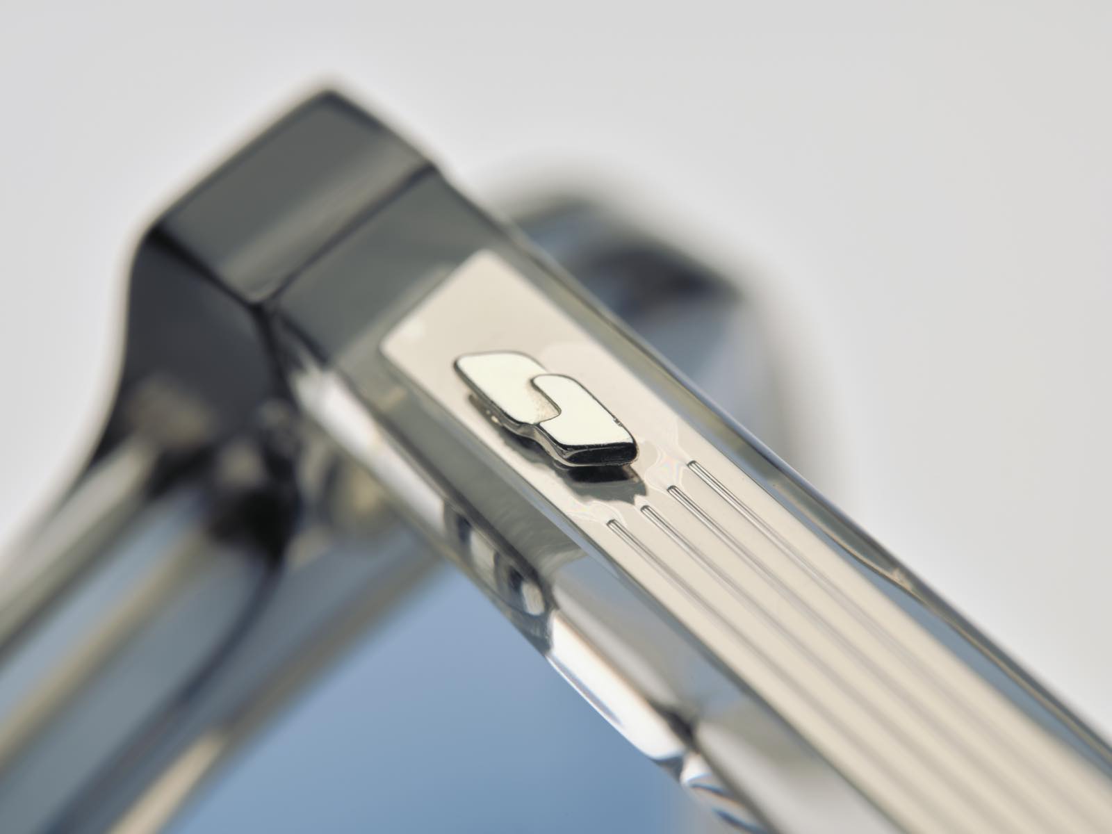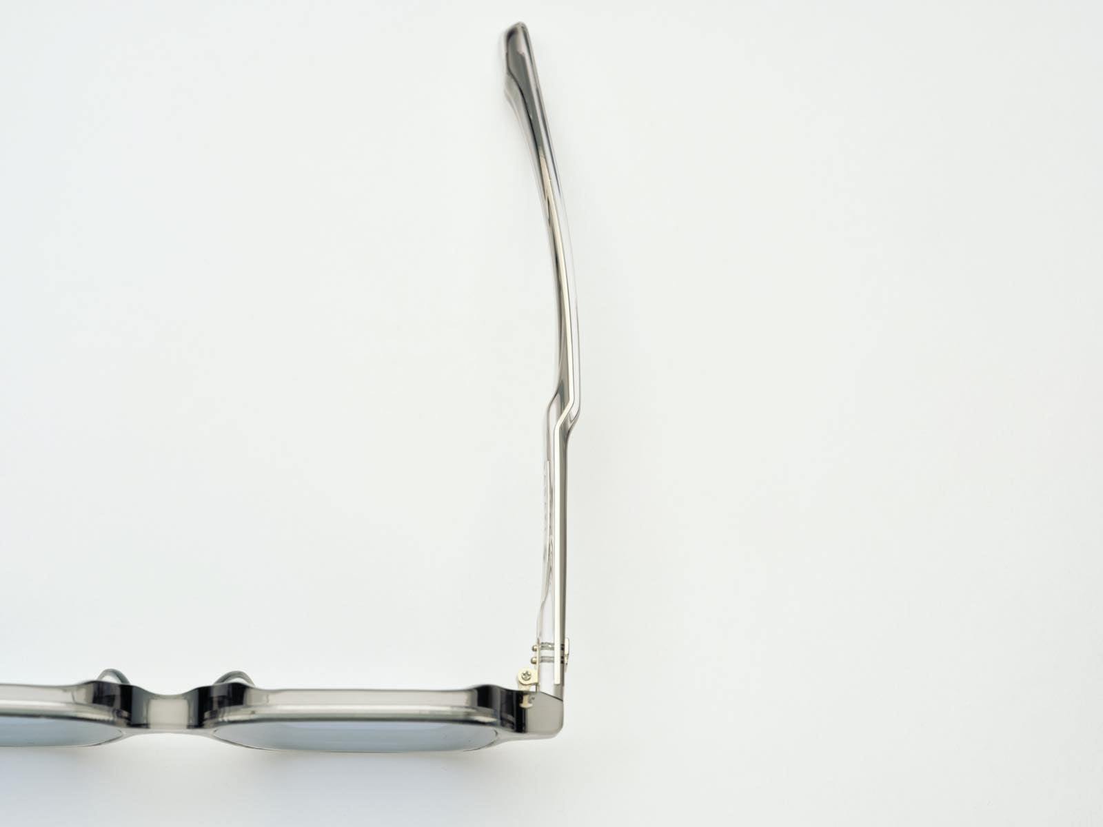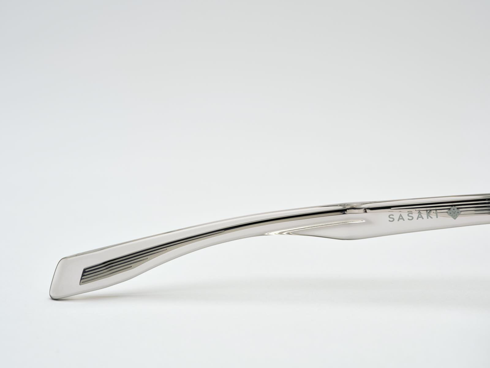 フラットレンズを前面からはめ込んだ仕様で、直線的なデザインが圧倒的にクールなモデル。テンプルは特許取得構造。細めながらも曲げを施すことでバネ性を保ち、お顔を包み込むような掛け心地の良さを確保。周囲とは一線を画した個性を演出したい方におすすめです。テンプルの飾りは日本の桜をモチーフにしており、職人の潔い一本気を表現。