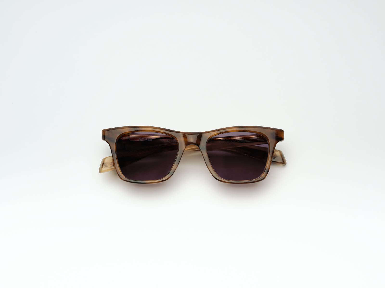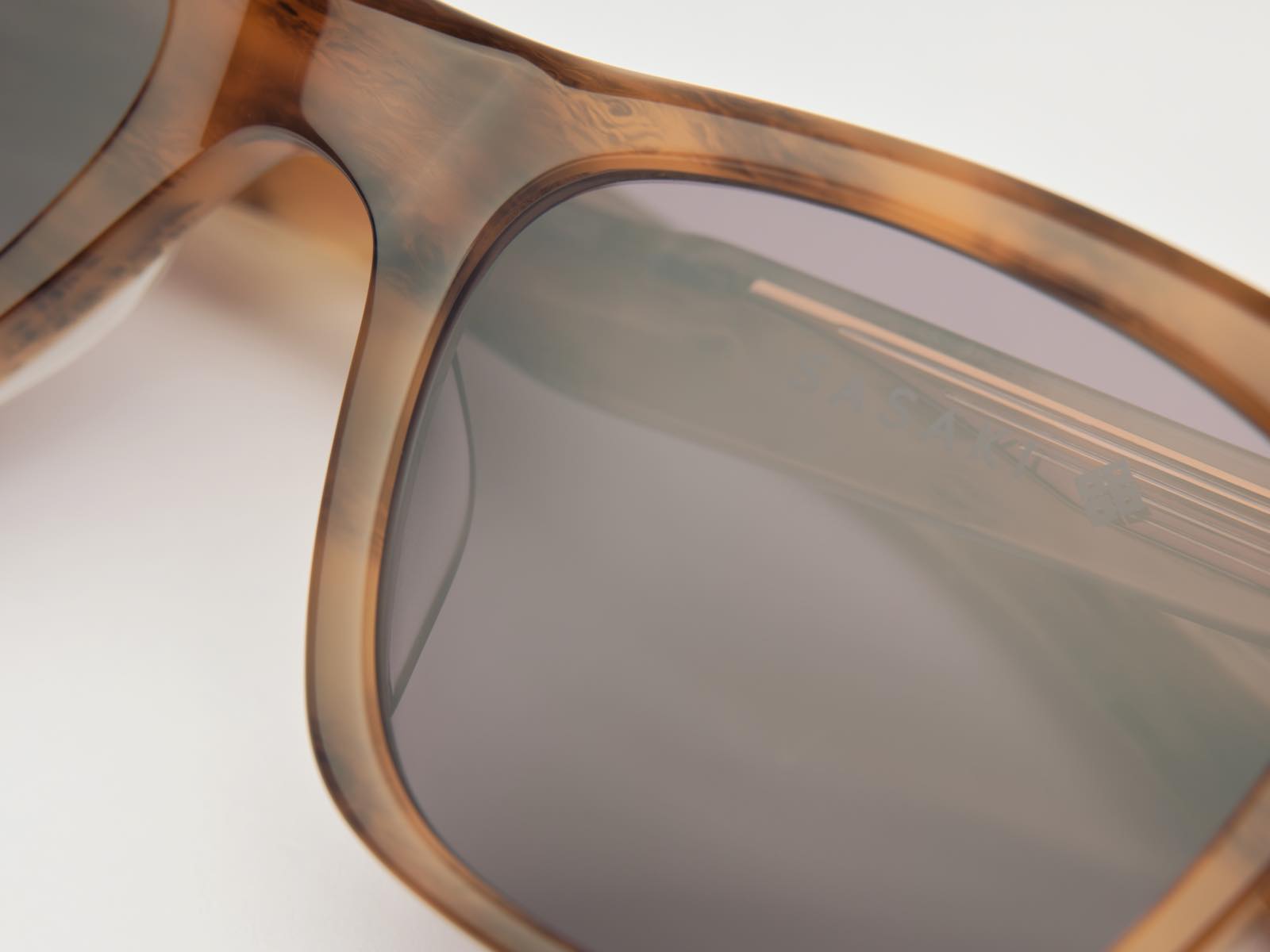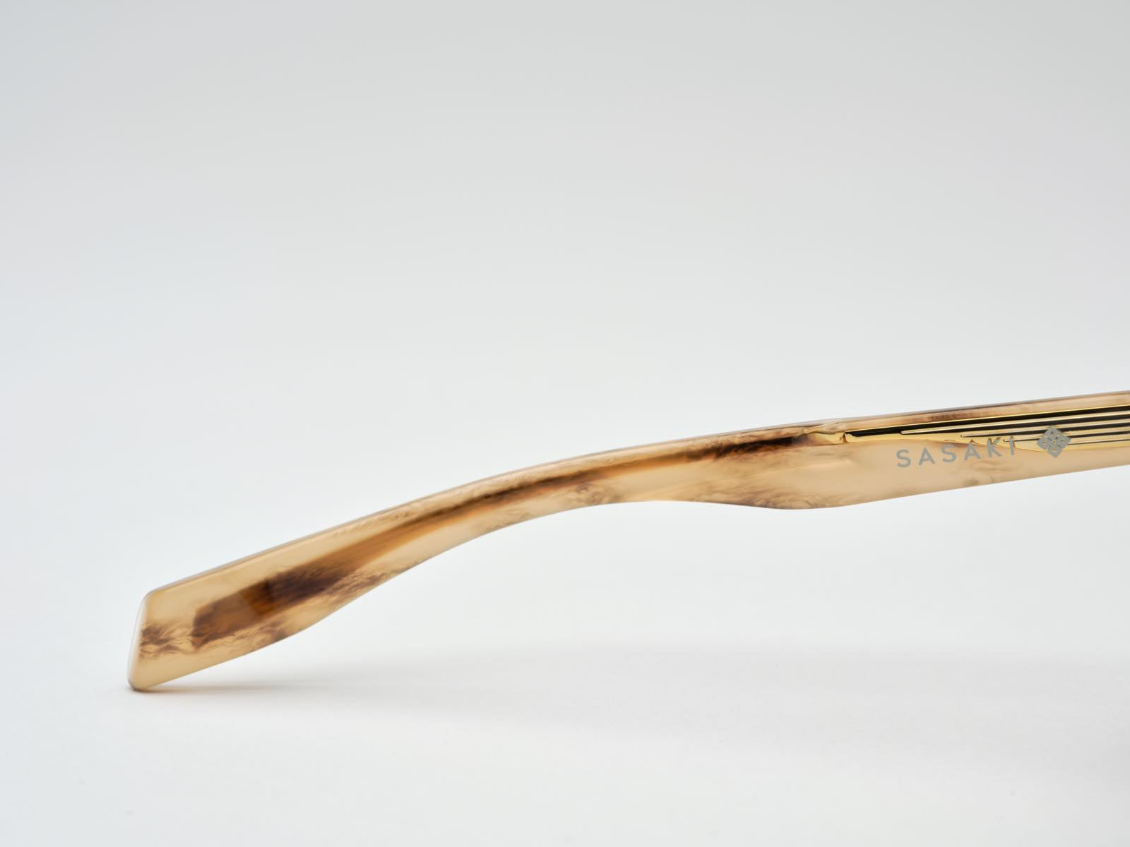 佐々木セルロイド工業所の100年余りに渡る歴史と培ってきた技術を体現したブランド、「SASAKI」。ブランドロゴには佐々木家の家紋を施し、最高峰の品質と一族の誇りを表しています。家紋はアイコンブランドである「SASAKI」にのみ施されており、また、出荷前には佐々木家の者が最終検品を行い、品質の証として家紋を手押ししています。アイコンモデルであるSUEKICHIを始め、KAZUMA、TAKAEなど、佐々木家を繋いできた人々の名前をモデル名に採用しています。鯖江の製造工場ならではの伝統的な職人技術とエッジのあるデザインが融合した結晶であり、掛け心地の快適さと掛けることによる気分の高揚感をいずれも満たしてくれる逸品です。
