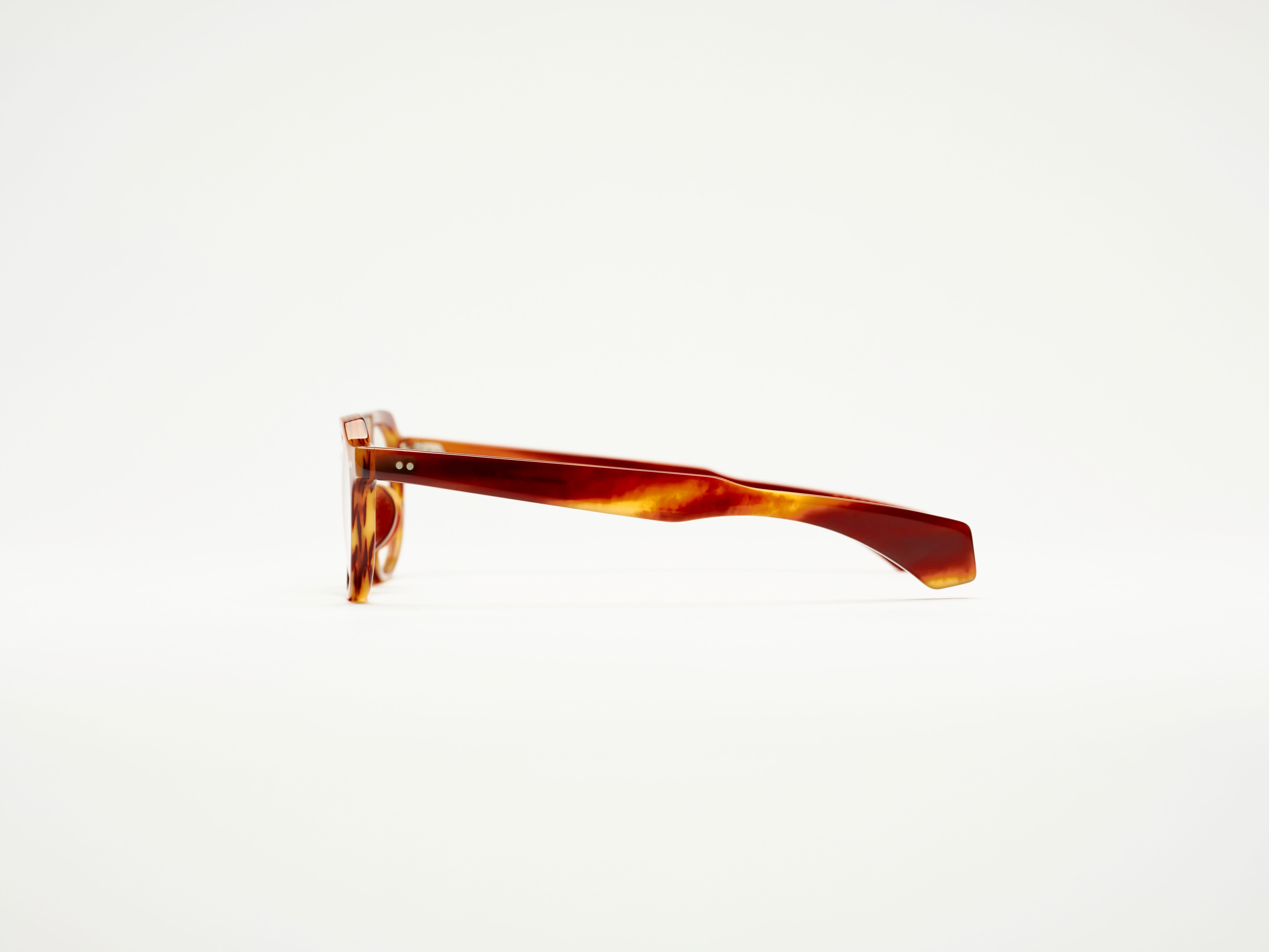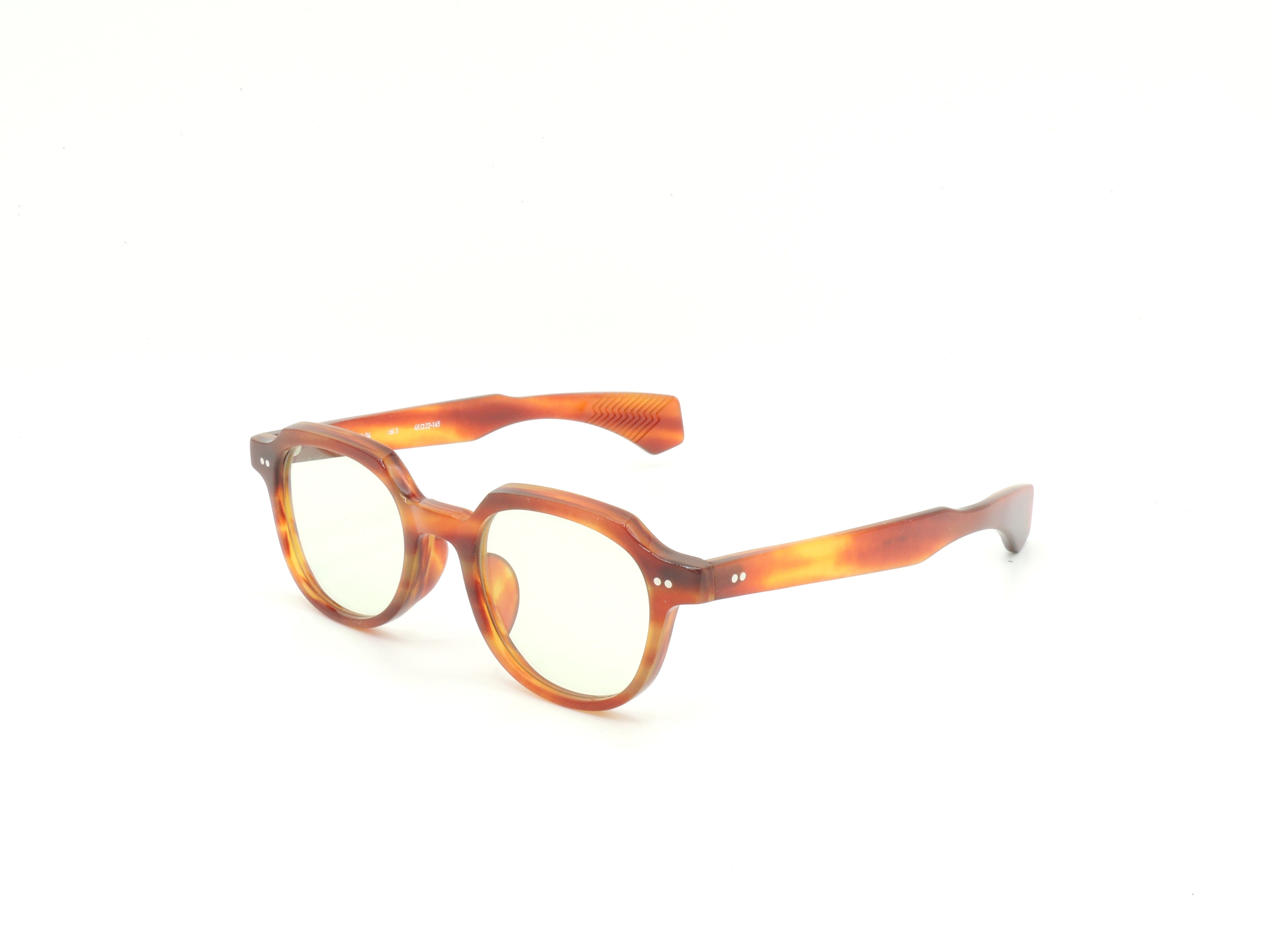 通常使われるアセテート素材のメガネでは、金属の芯をテンプルに刺して強度を出します。しかしセルロイドは固いため、芯を使わず十分な強度を出すことが可能です。金属の芯を補強に使わない“ノー芯”製法は、セルロイド本来の美しさを金属の邪魔なく堪能できるのが魅力。特に濃淡のある色味のセルロイドはテンプルの部分が透けて見えるのが美しいです。佐々木セルロイドの社内デザイナーが綿密に設計し、職人が手で丁寧に加工することで芯を使わずとも強度を出すことを実現しました。