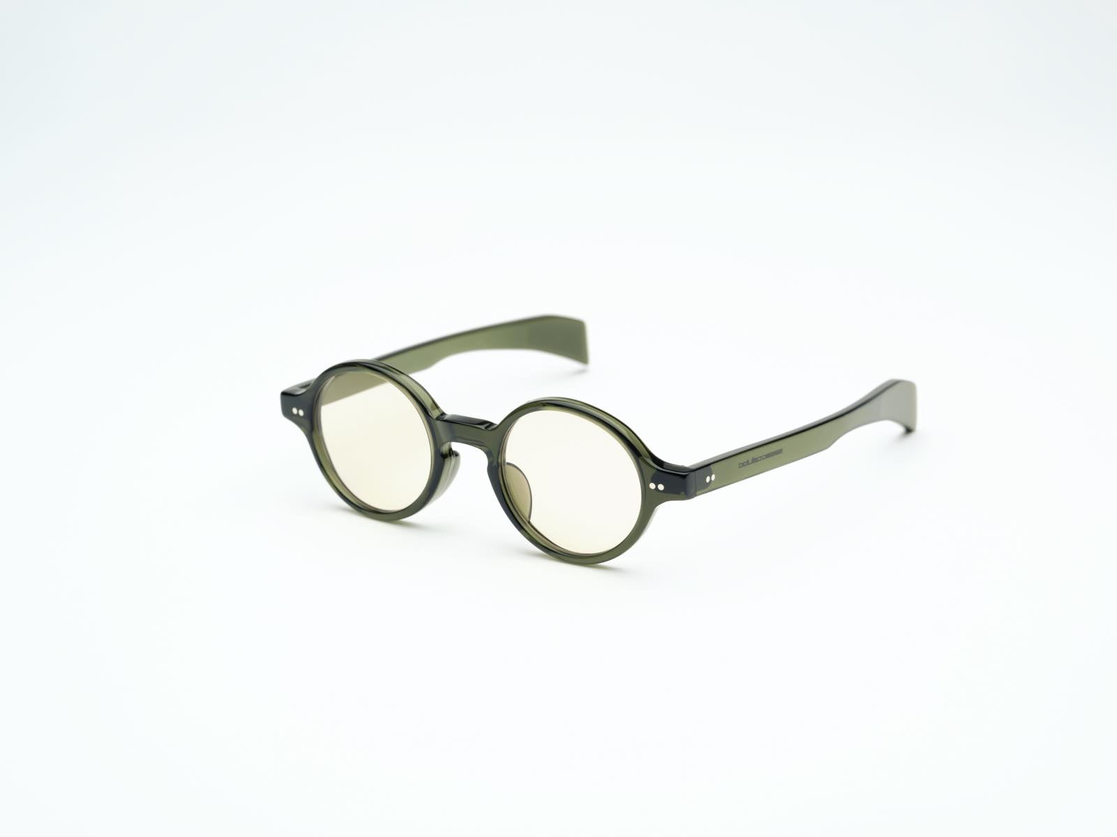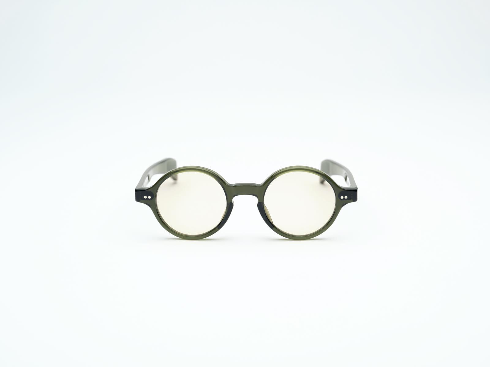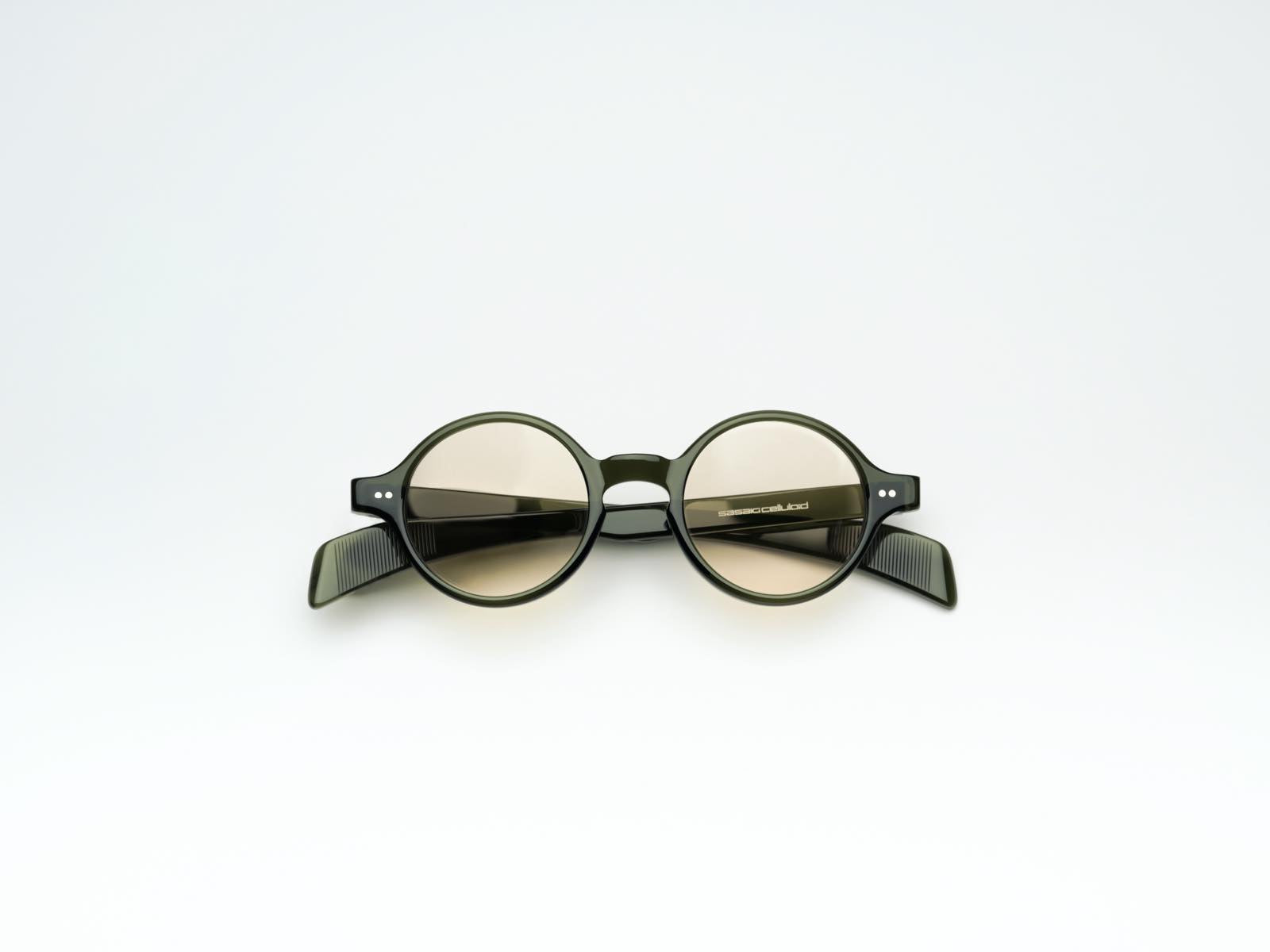 丸メガネというと個性的なイメージがあるので敬遠されがちですが、SSK-03のラウンドシェイプは鼻部分のブリッジと智の位置バランスを絶妙に設計しているため、初めてのラウンドデザインに最適です。気軽に掛けるだけでコーディネートをおしゃれにしてくれます。品良く透けるカーキカラーは新たなグリーンの楽しみ方を教えてくれます。セルロイドでしか得られない深い艶が魅力です。