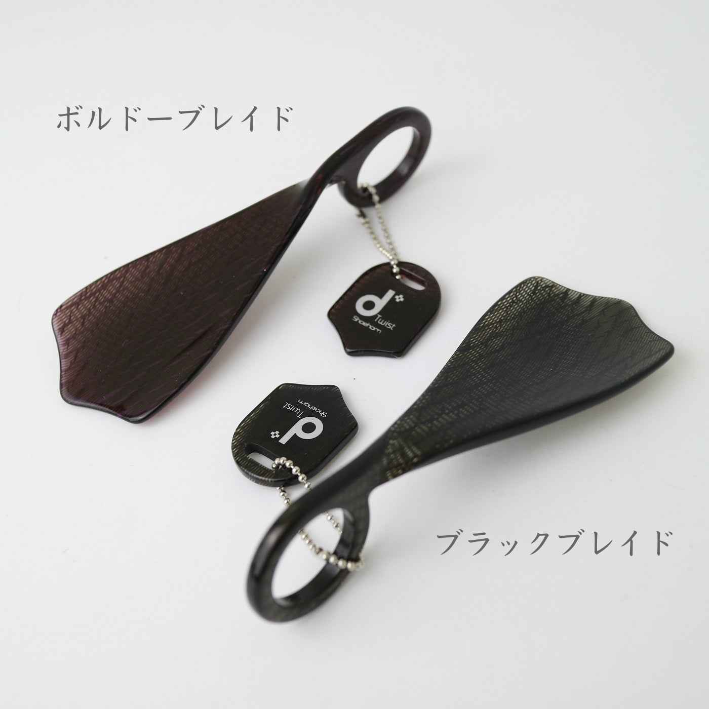 素材はメガネフレームに使用するセルロースアセート。「d」の文字をひねったようなデザインは指を絡めやすく、靴を履く際に非常に使いやすい形となっています。大切な人への贈り物としてもおすすめ。いつでも手が届くところに置いて、日常使いしてほしい逸品です。