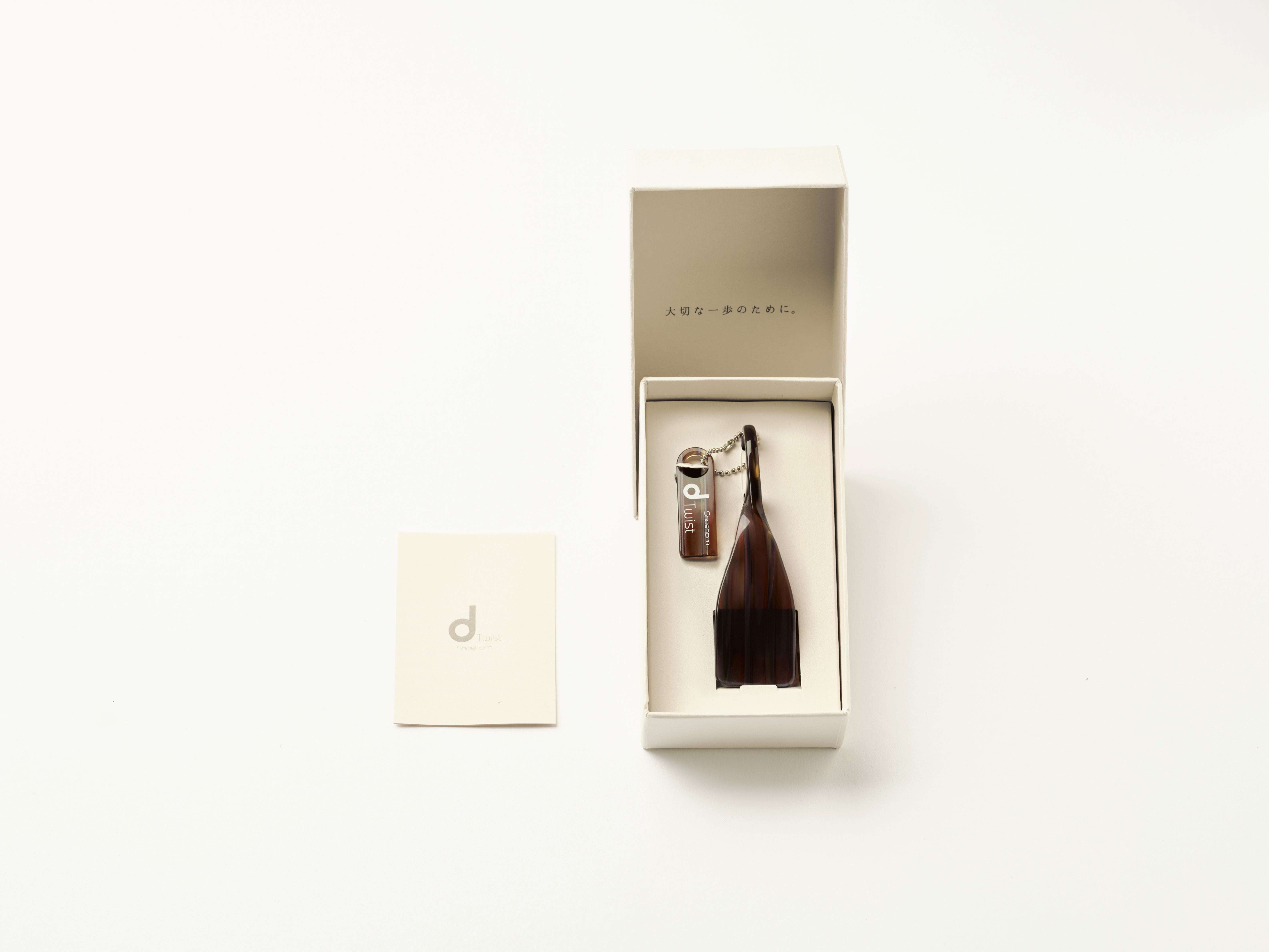 佐々木セルロイド工業所の職人がひとつひとつ磨き上げる「d」のひねり。 靴を履く所作において、最も使いやすい角度を追求した形です。 Shoehorn「d-Twist」は、職人の手によりひとつひとつ丁寧に磨きをかけ生み出されたものです。素材はメガネフレームに使用するセルロースアセート。「d」の文字をひねったようなデザインは靴を履く際非常に使いやすい形となっています。大切な人への贈り物としてもお勧めしております。 靴べらとしての役割だけでなくファッションアイテムとしてもお使い頂けます。バッグにひとつのアクセントとして飾ってみたり、またキーホルダーとしていつでも手が届くところに着けてみたりとさまざまです。