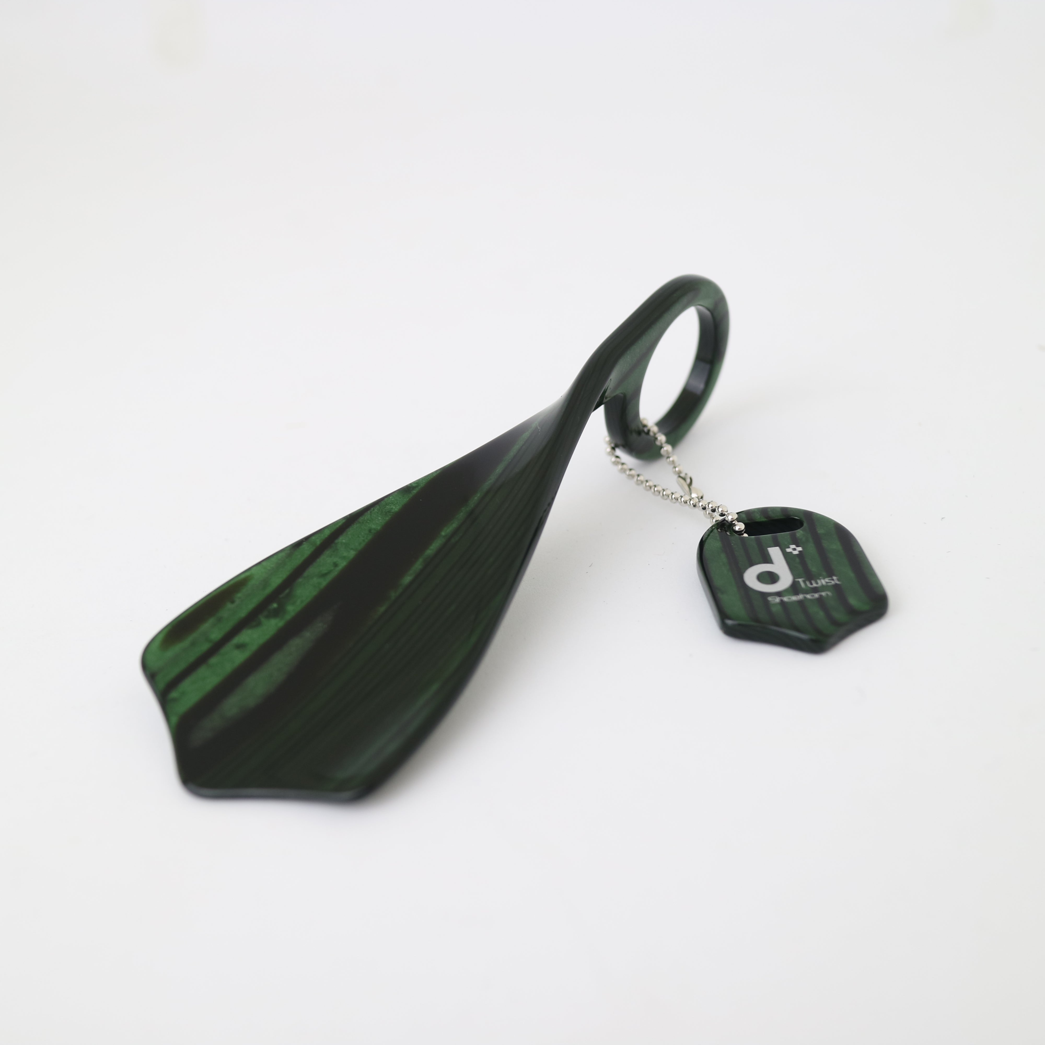 The very popular shoehorn, d-Twist, has been made slightly larger to create the d-Twist+ (Plus), which is easier to use for those with larger hands. The twist of the "d," polished one by one by craftsmen at Sasaki Celluloid Industry, pursues the most user-friendly angle for the act of putting on shoes.