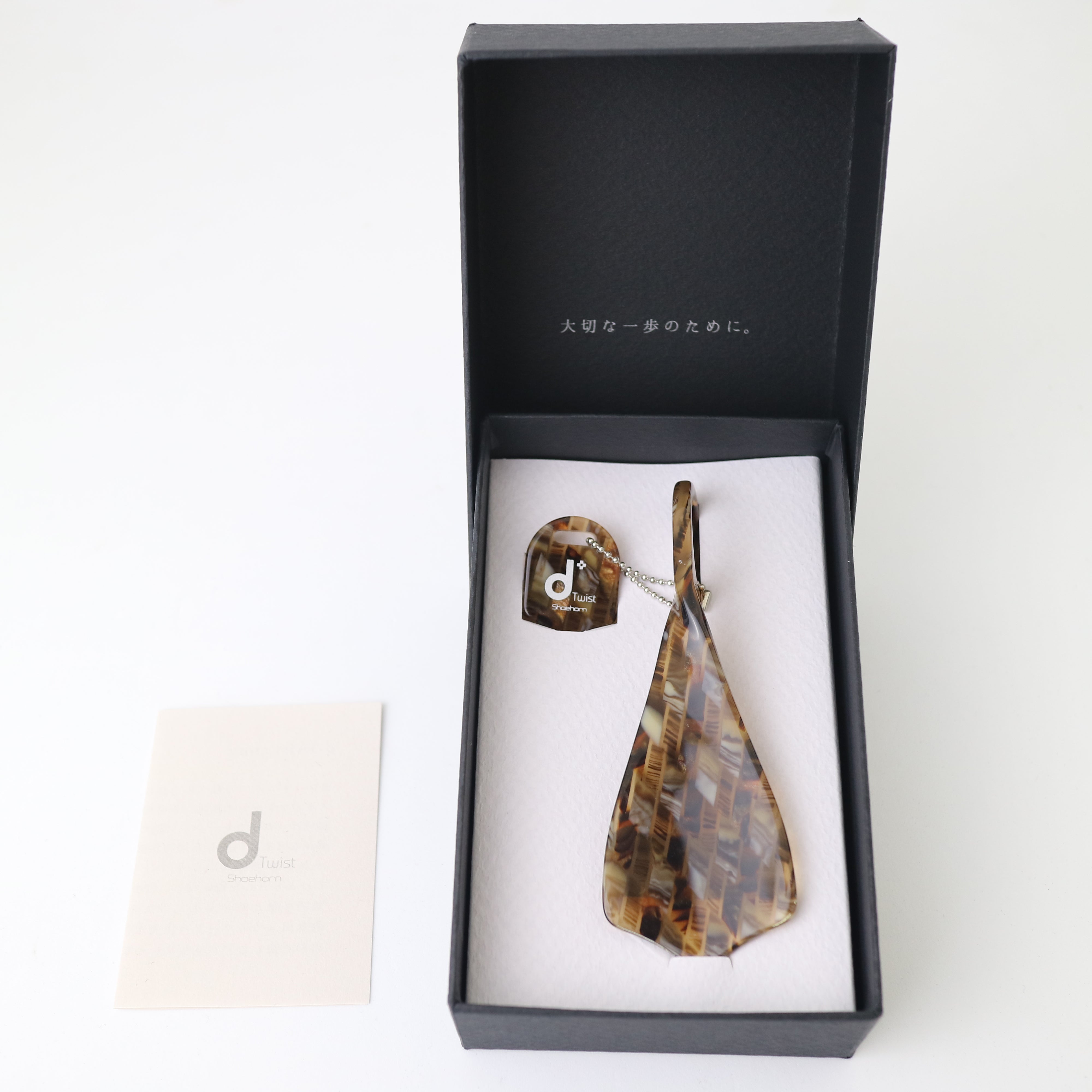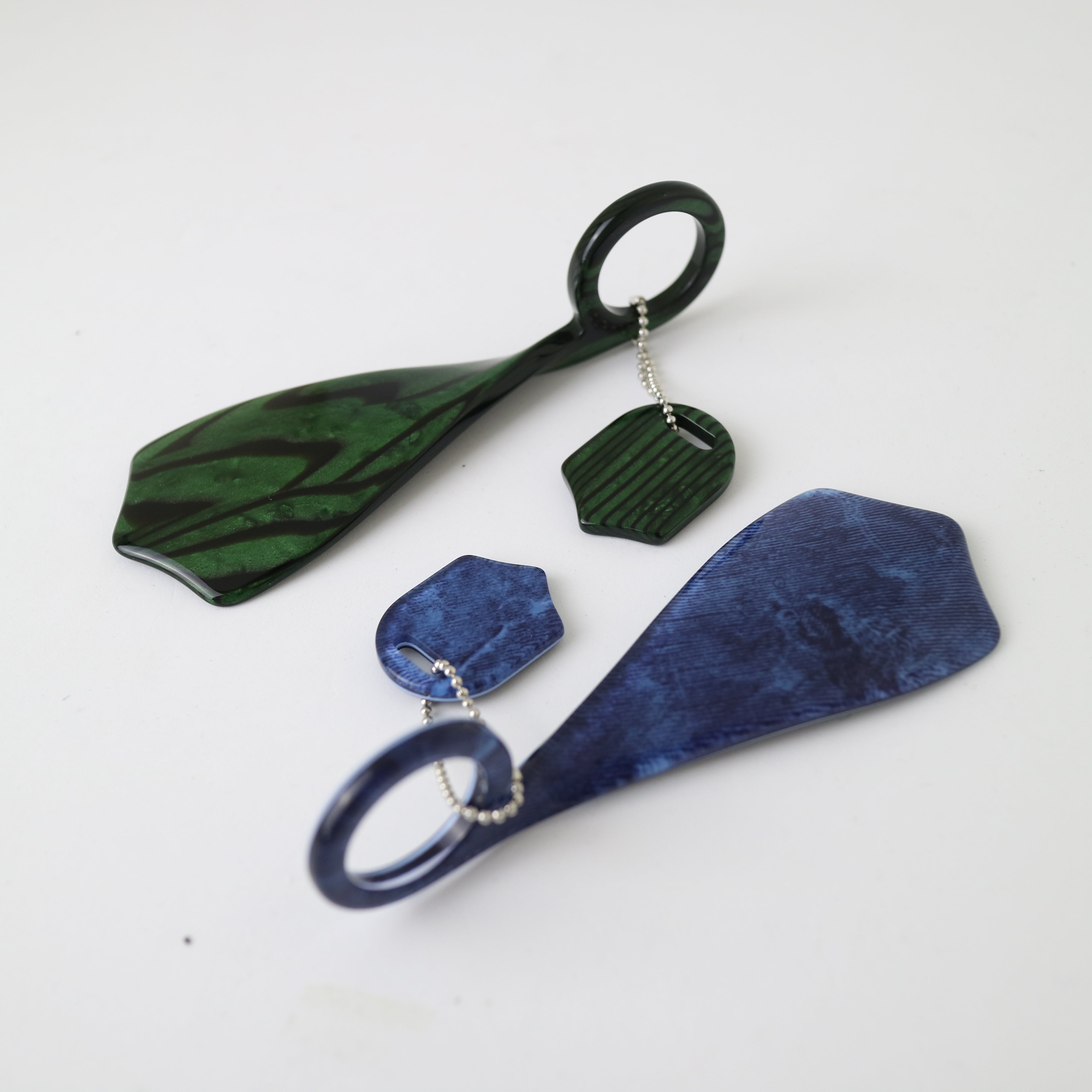 The material is cellulose acetate used for eyeglass frames. The design, which looks like the letter "d" twisted, makes it easy to interlock your fingers and is very convenient when putting on shoes. It is also recommended as a gift for someone special. It is a masterpiece you want to keep within reach and use daily.